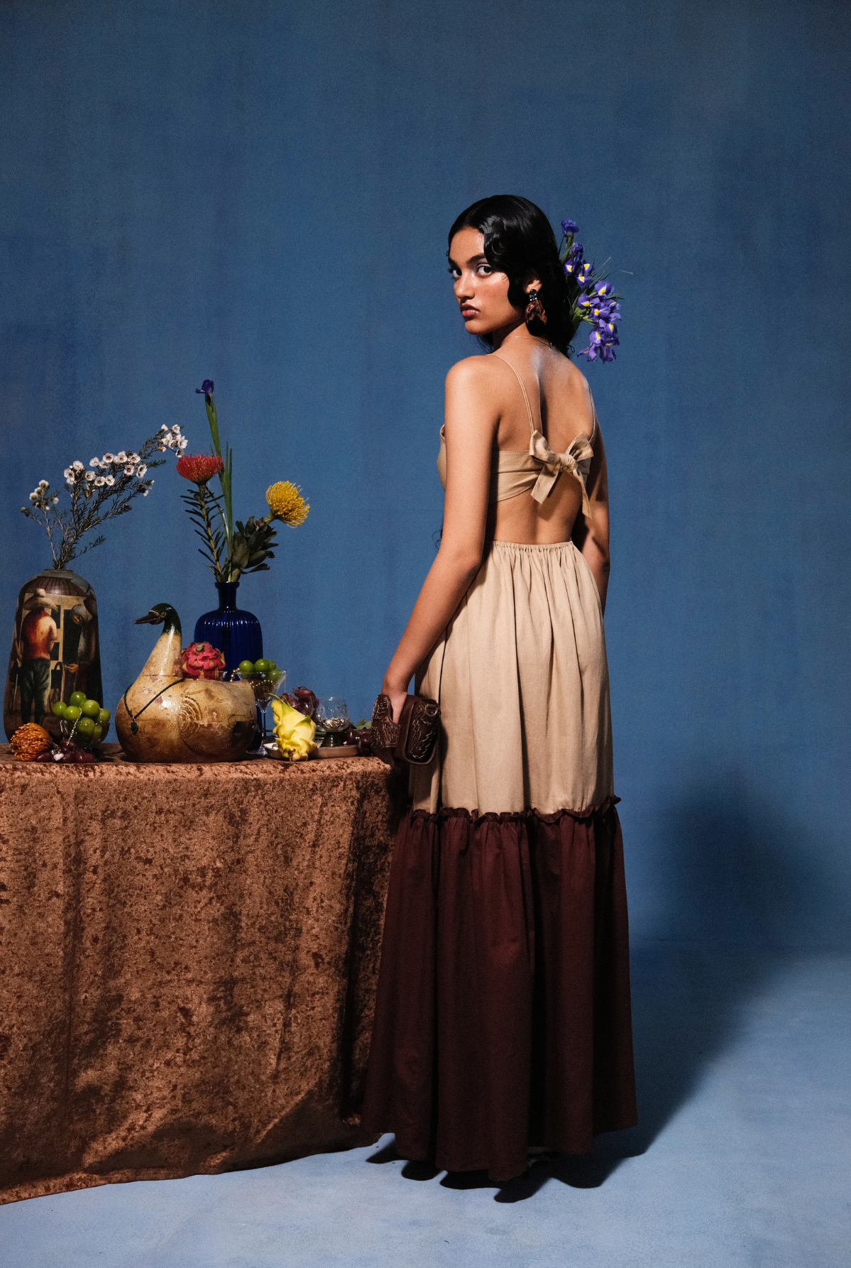 A maxi cut-out, tiered dress with a tie-up back.