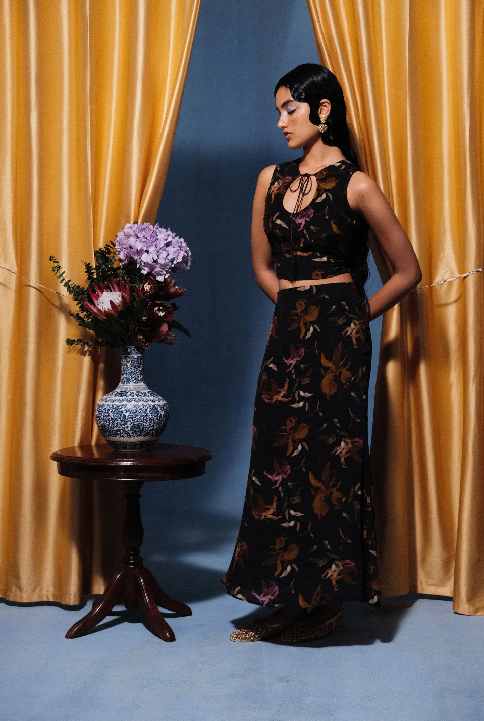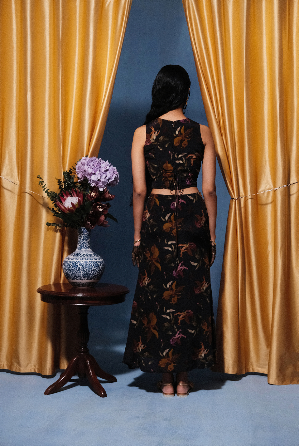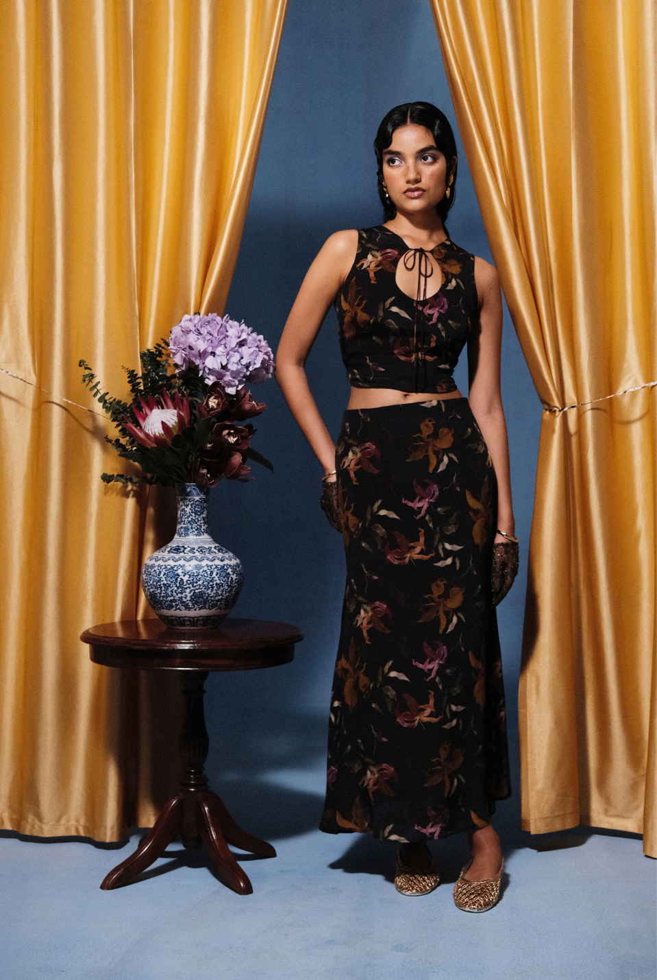 Crafted as a homage to this lifelong romance, the Wilde Set pairs a fitted, sleeveless top with a graceful, ankle-grazing skirt. The top, with its keyhole tie detail, frames the neckline in quiet allure, while its cropped finish introduces a note of boldness. The skirt falls in a fluid line, carrying ease and elegance in every step. Together, they create a portrait of self-reverence – designed for the woman who, each day, chooses to fall deeply in love with herself.